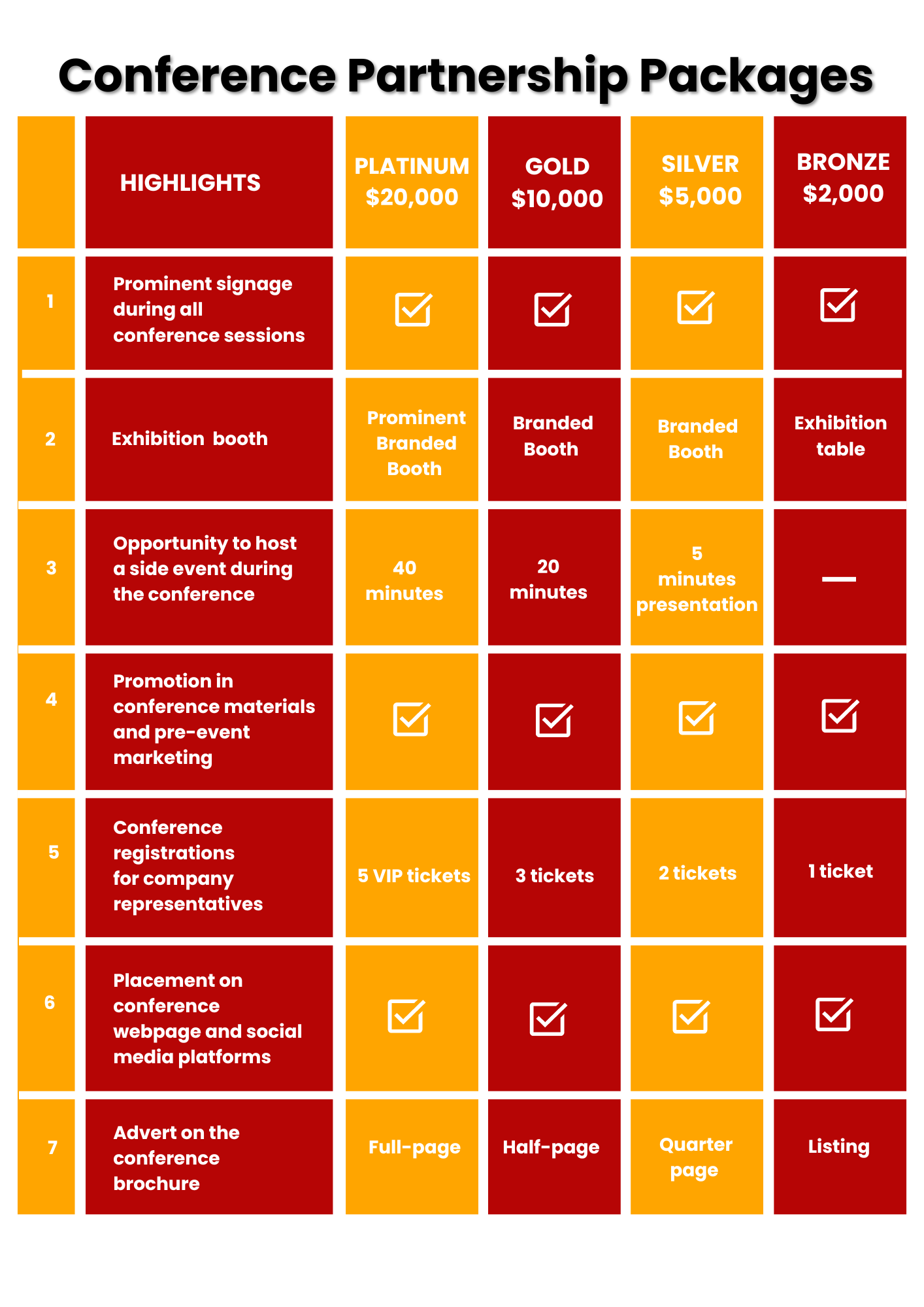 Platinum Sponsor ($20,000): As a platinum sponsor, your organization will receive maximum exposure and recognition throughout the conference. Benefits include prominent logo placement on marketing materials, exclusive speaking opportunities, dedicated exhibition space, and VIP access to networking events.